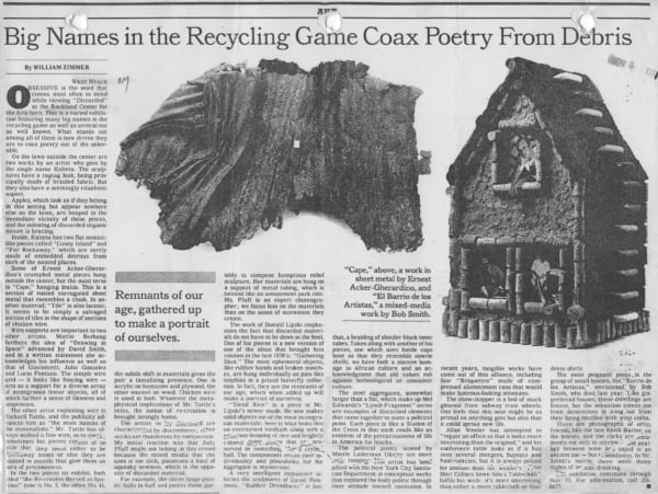 New York TimesNovember 8, 1991 OBSESSIVE is the word that comes most often to mind while viewing 'Discarded' at the Rockland Center for the Arts... -