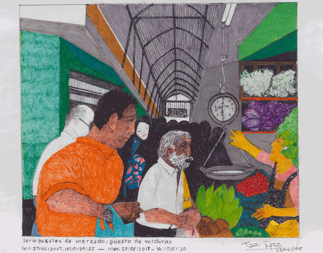 In Untitled (contigo...) final de la obra - octuber 2013 - viernes 18 - hora: - 08:06 P.M. (2013), Burga employs this pseudo-mechanical approach to copy the same source material three times. Carefully recording the time it takes her to create the triptych—clocking in and out—she draws parallels between artistic creation and other forms of labor. Recreating by hand a mechanical process intended for mass image dissemination, the artist challenges the labor hierarchy, which privileges innovation over reproduction. -